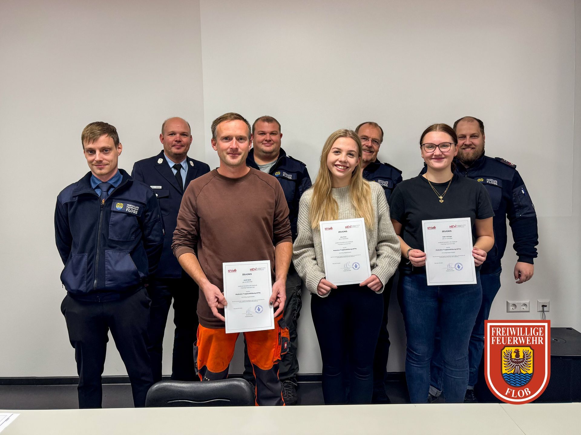 Zur Abnahme der Prüfung fanden sich Kreisbrandmeister Alexander Klettner zusammen mit den Prüfern Felix Müller, Florian Witzl und Felix Witzl am Flosser Gerätehaus ein. Sie konnten jeweils eine hervorragende Leistung bestätigen. Schließlich konnten die Urkunden zur Truppführerqualifikation überreicht werden. Ihnen steht nun der Weg offen zur weiteren Karriere an den staatlichen Feuerwehrschulen, beispielsweise als Gruppen-/ Zugführer, Kommandant oder andere Führungsaufgaben.
