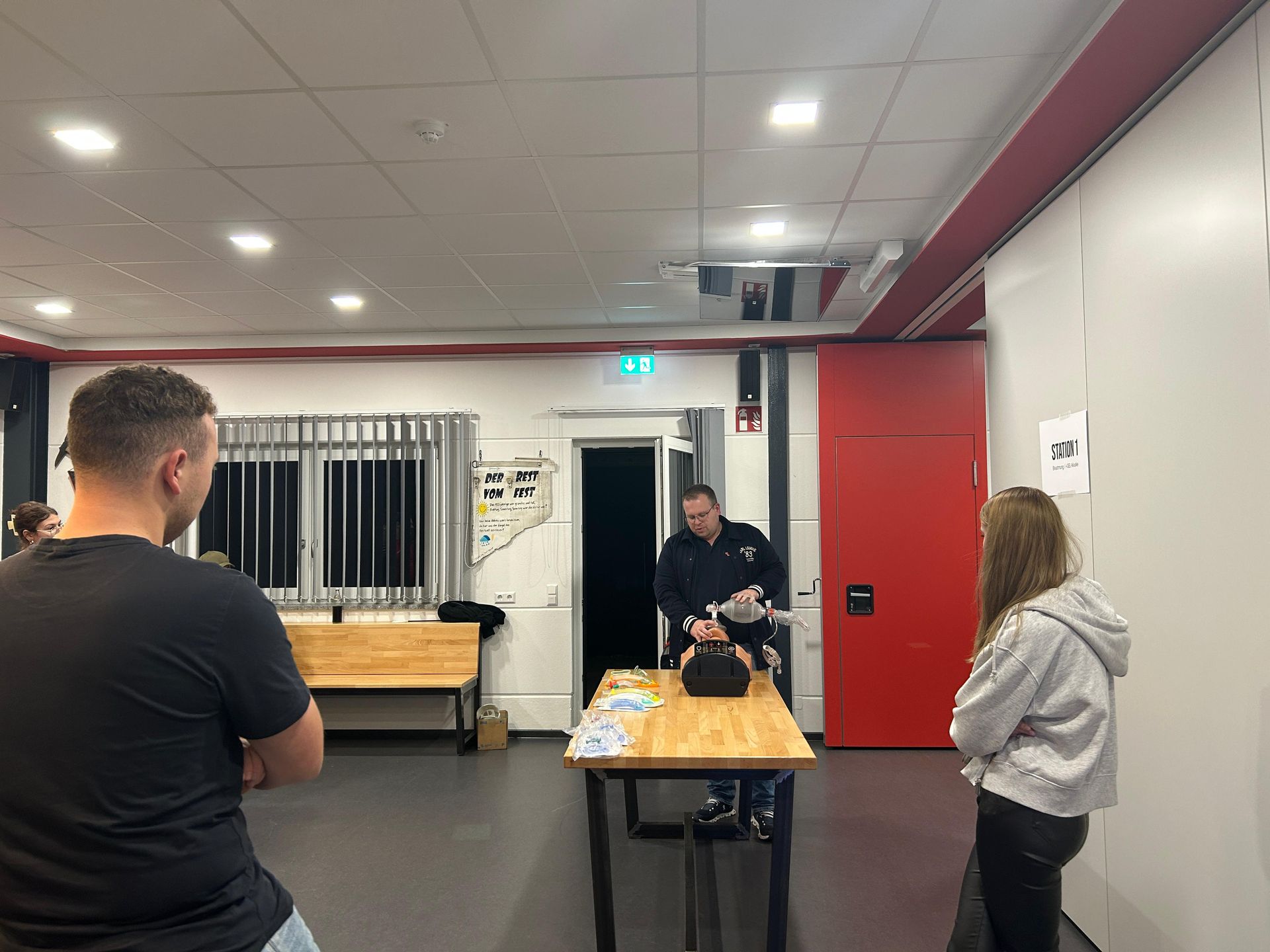 Die Kameraden Klaus Heimann und Stefan Hirmer führten uns durch das Fahrzeug und gaben uns eine ausführliche Einführung in die vielfältige Ausrüstung des GW-G. Vom speziellen Schutzanzug über verschiedene Messgeräte bis hin zu Werkzeugen für den Umgang mit Gefahrstoffen – wir konnten uns ein genaues Bild davon machen, was bei Gefahrguteinsätzen alles notwendig ist.