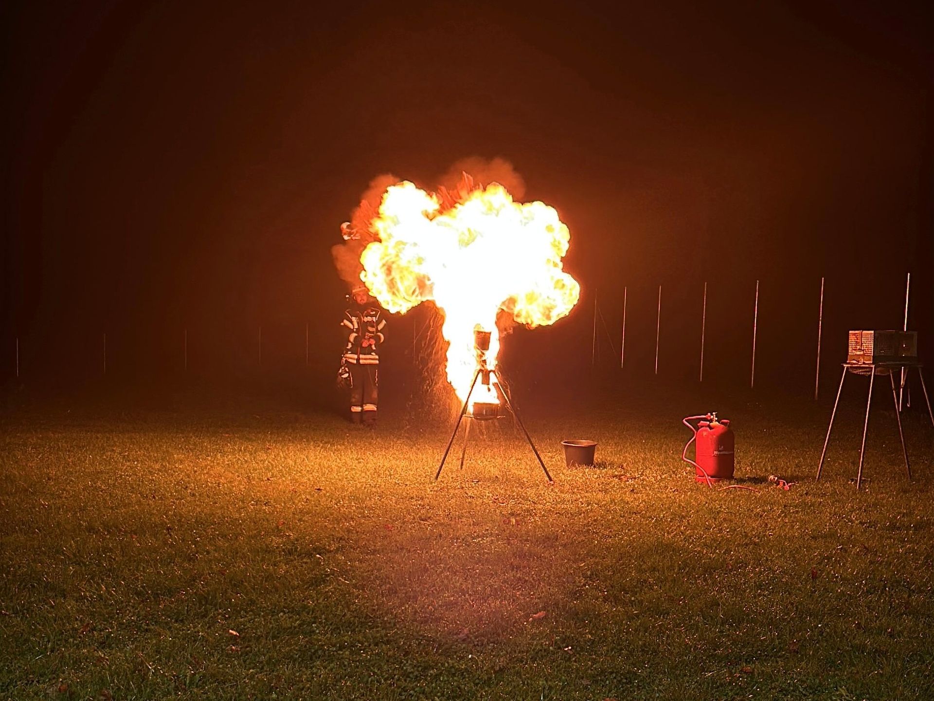 Zum Abschluss wurde den Teilnehmern eine kurze feuerwehrtechnische Vorführung geboten: eine beeindruckende Fettexplosion, die die Gefahren im Umgang mit brennendem Fett aufzeigte.