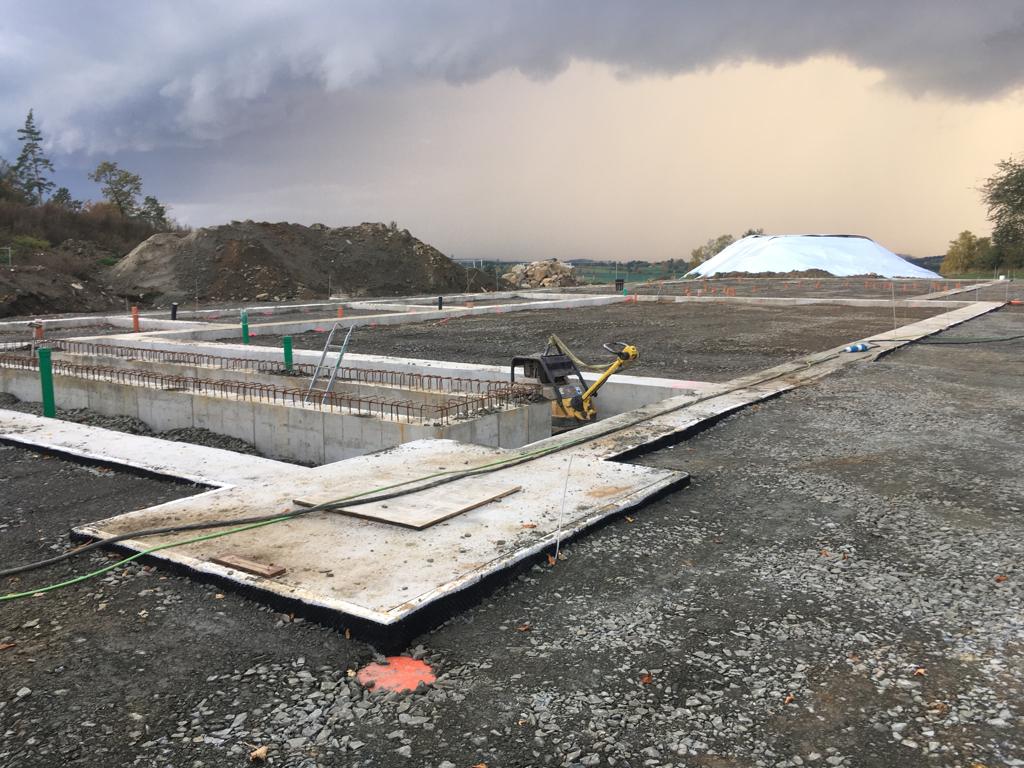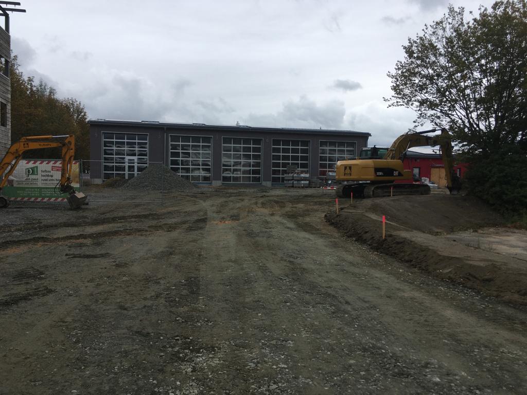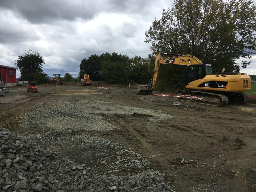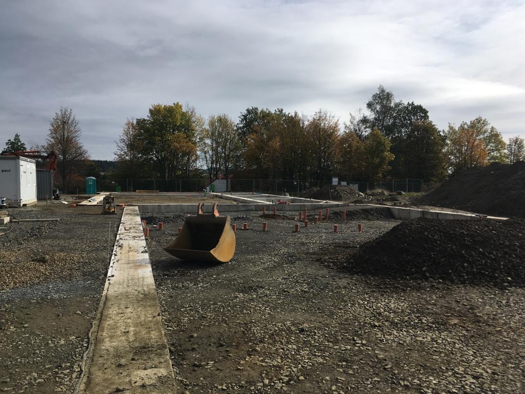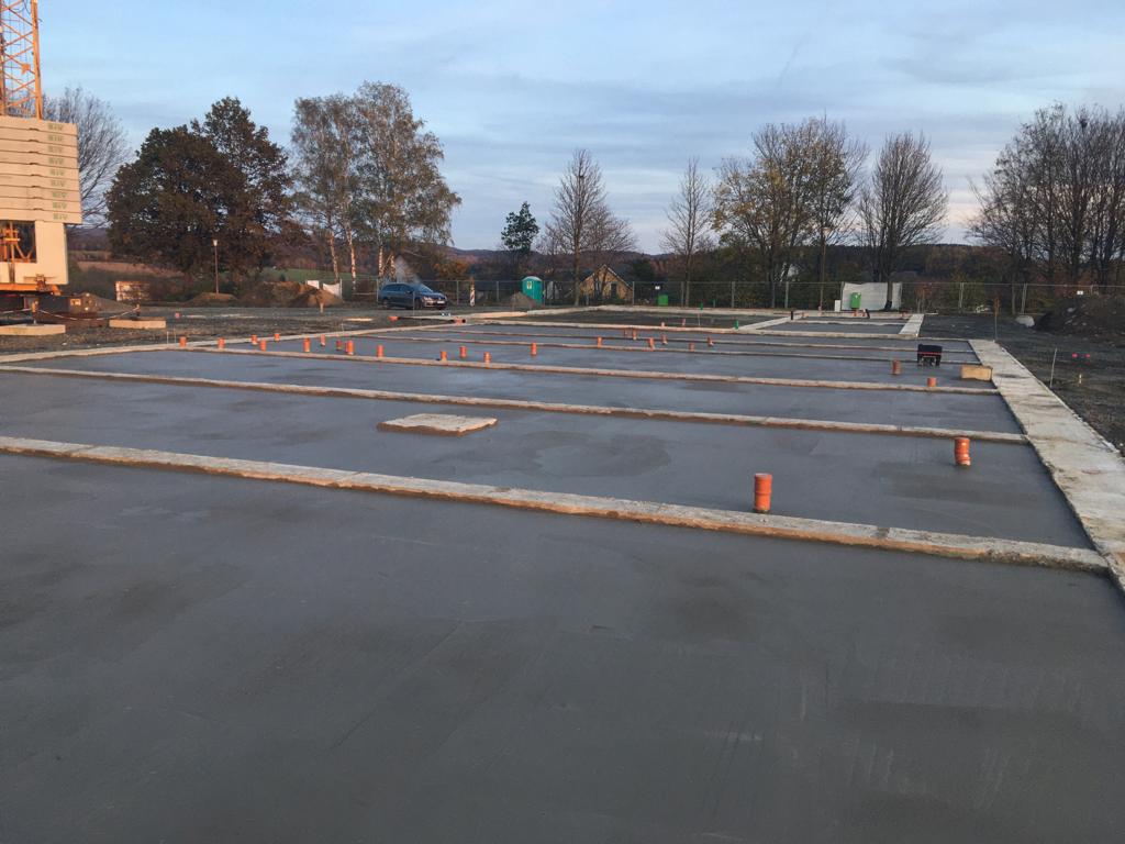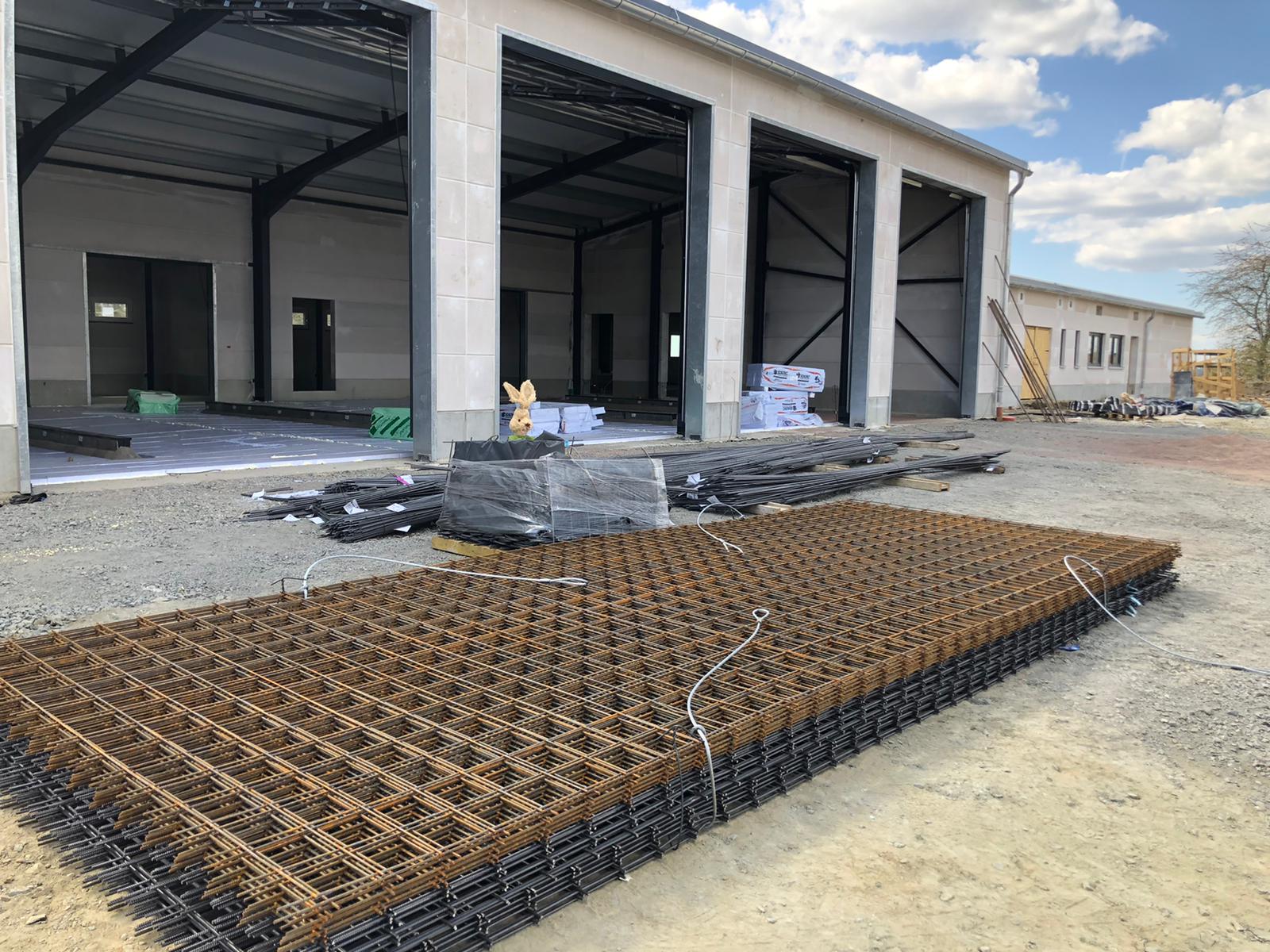 ➡️ Mit der Bodenplatte in der Fahrzeughalle wurde begonnen.