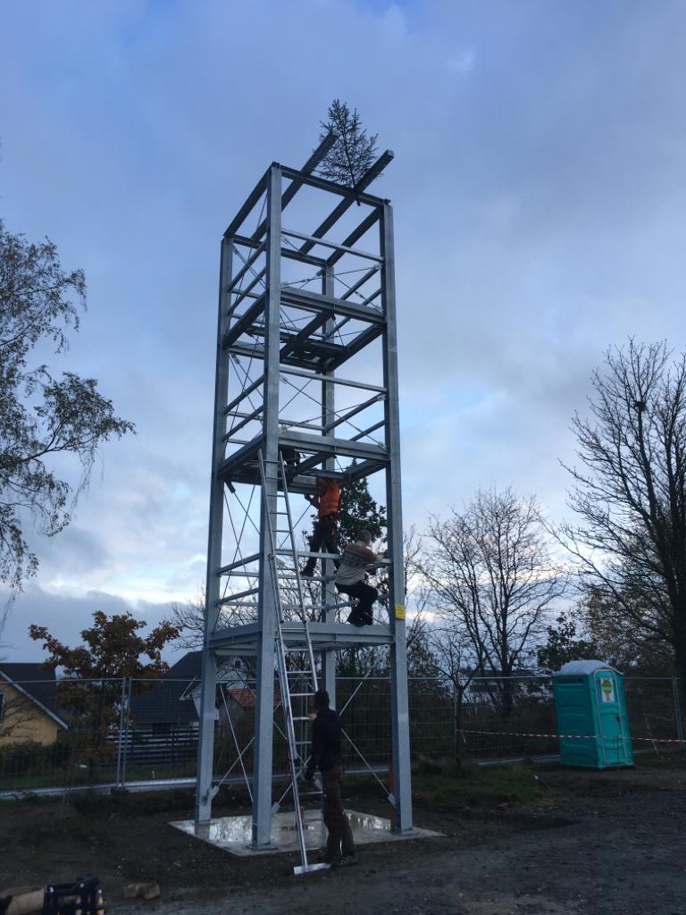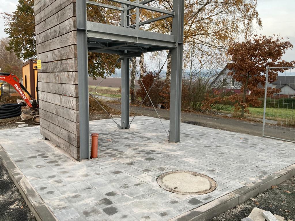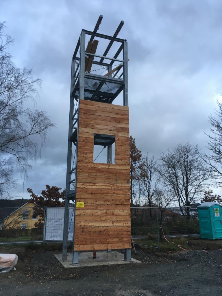 Nach dem Richtfest geht’s auf der Baustelle weiter voran. Diese Woche wurde am Turm weitergearbeitet, die Holzverkleidung soll eine Hausfassade simulieren. Außerdem haben die Arbeiten an der Dämmung für die Fußbodenplatte in der Fahrzeughalle begonnen.