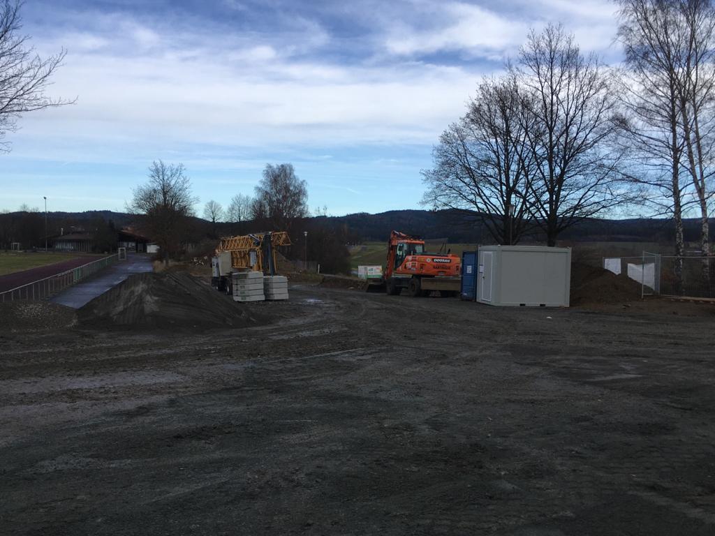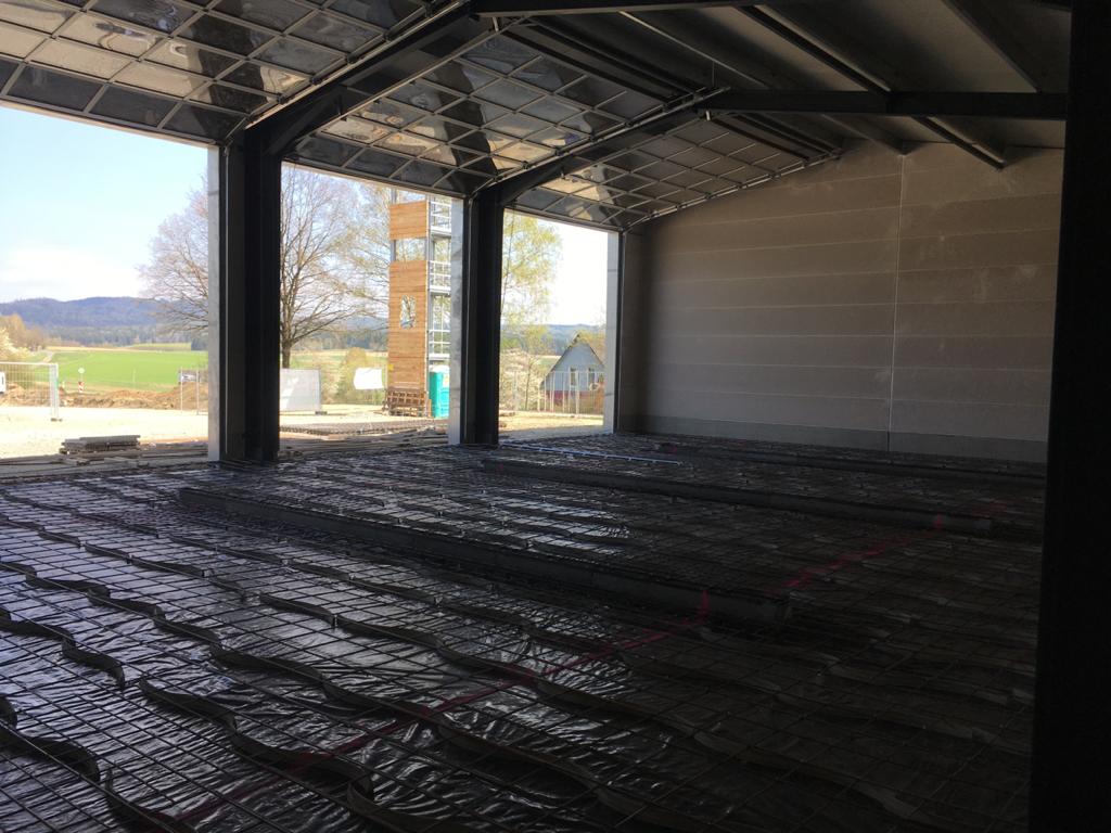 Die Fußbodenheizung liegt, der Stahl auch. Beides wartet auf's Betonieren. (Fa. Hermann Paul, Weiden) nächste Woche. Im Sozialtrakt geht der Trockenbau (Fa. Ebert, Waldsassen) gut voran. Auch wurden bereits die Arbeiten an Sanitär (Fa. Rank, Weiden) und Lüftung (Fa. Ertl, Waldthurn) begonnen.