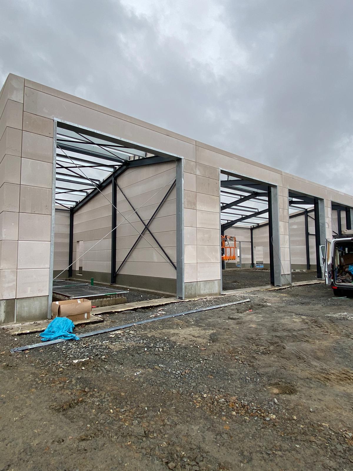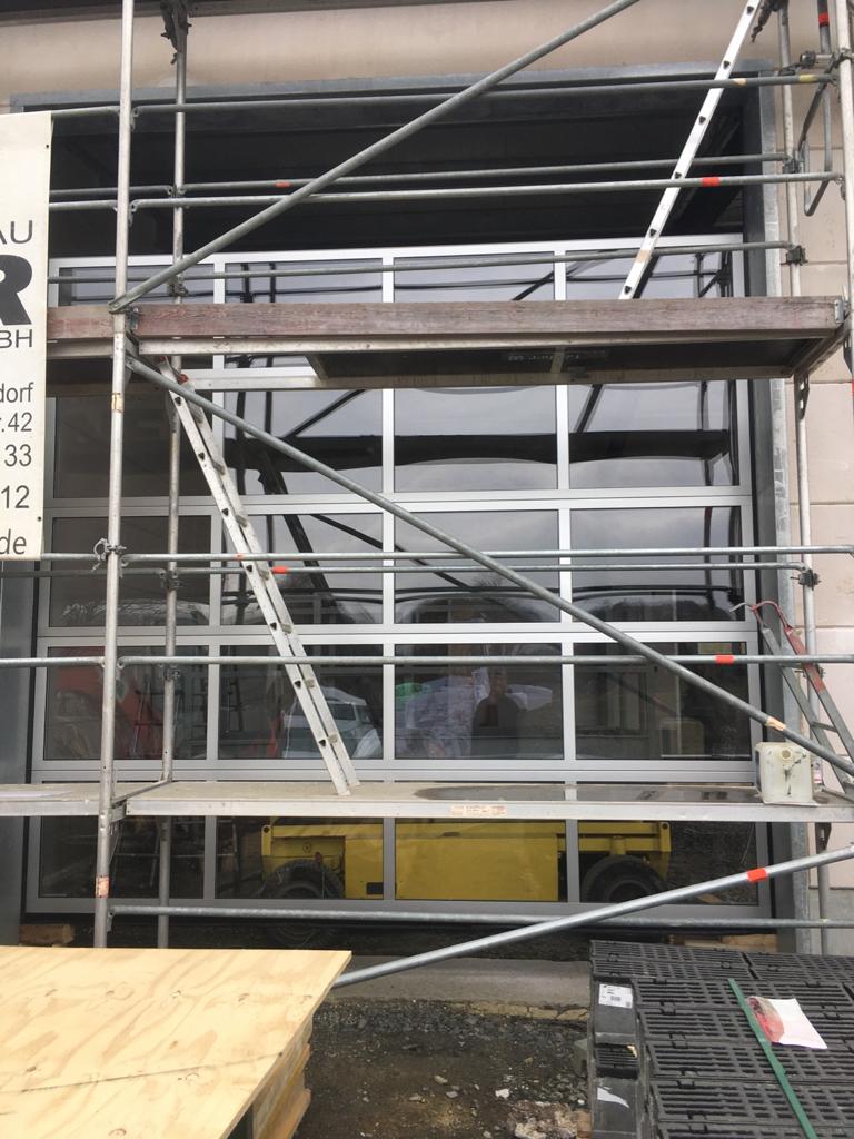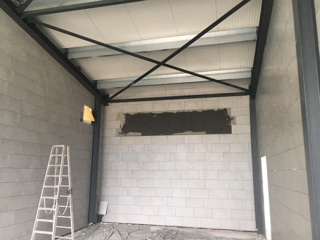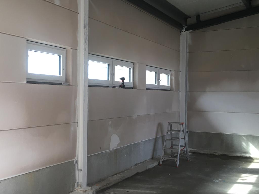 Es nimmt immer mehr Form an! Die letzten beiden Wochen wurden in der Waschhalle und den Sanitärbereichen Fliesen gelegt. Zum ersten Mal kann man jetzt auch die Fahrzeughalle von Außen mit den geschlossenen Toren sehen. Unterdessen beginnen im Inneren die Installationsarbeiten. Auch im Sozialtrakt sind die Innenausbauer weiterhin fleißig!