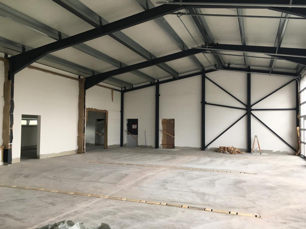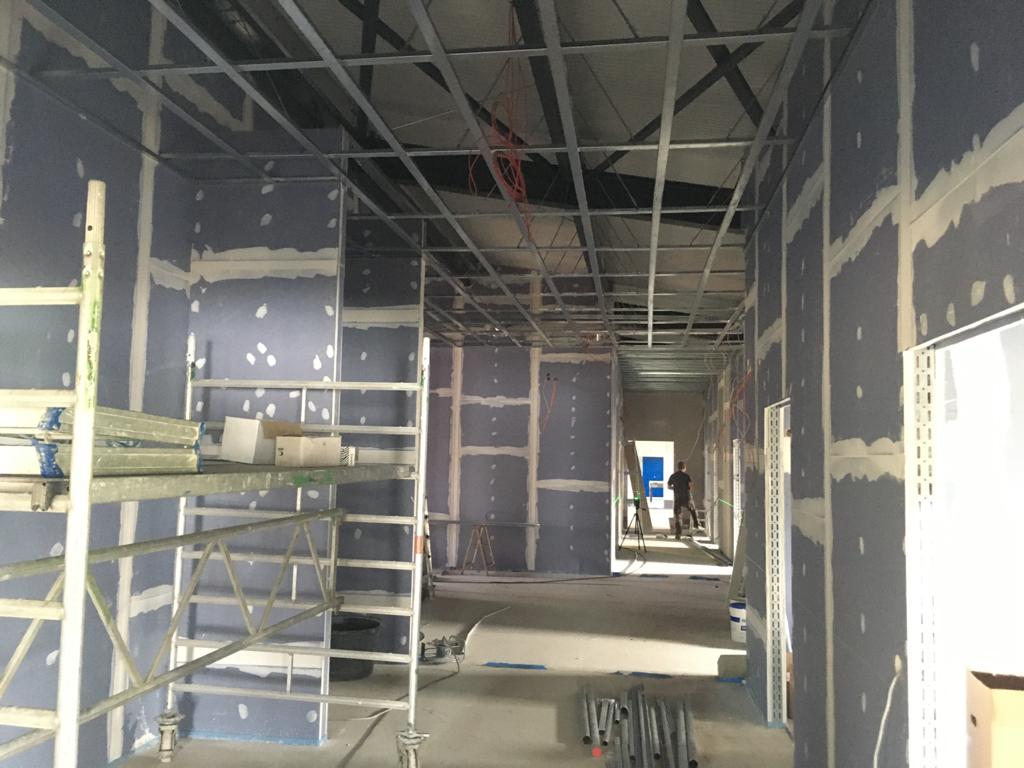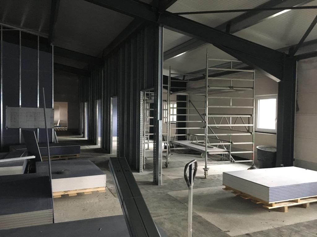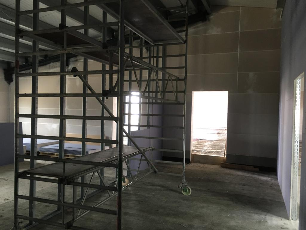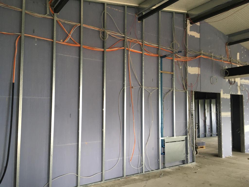 Das sieht doch gut aus! Die fertig gestrichene Fahrzeughalle erstrahlt in vollem Glanz, der Aufbau aller Anlagen kann nun beginnen. Außerdem wurden die Verteilerkästen für die Fußbodenheizung im Gebäude gesetzt. Trockenbau, Wasser, Elektrik und Sanitär wachsen stetig, der Innenausbau geht zügig voran.