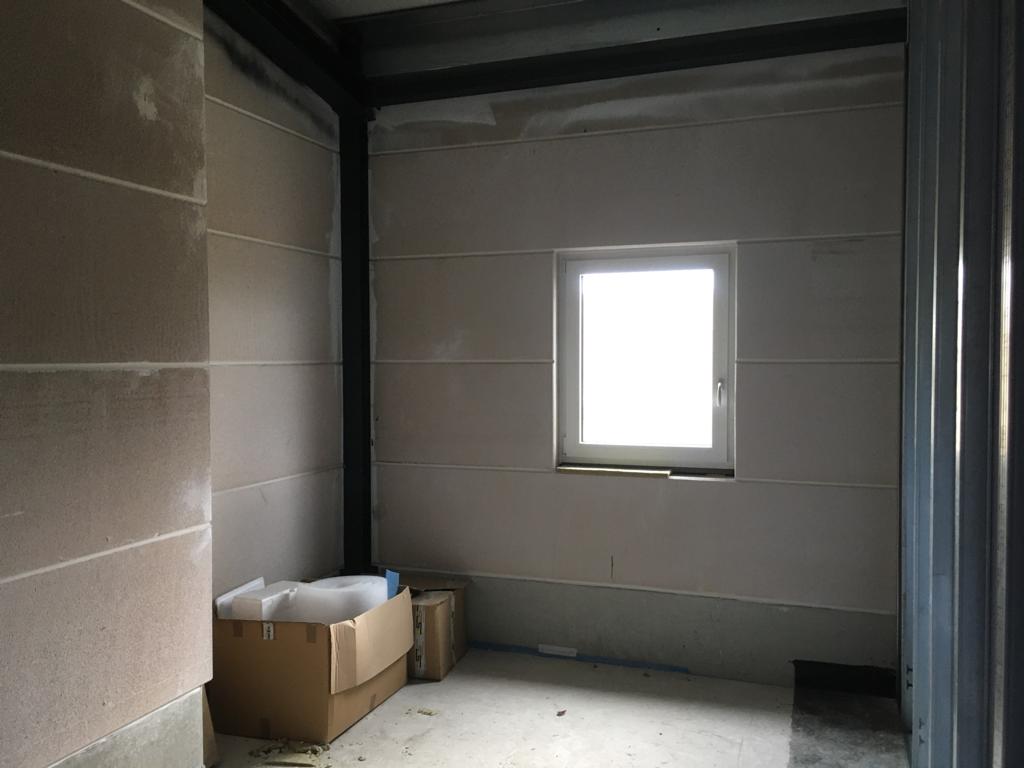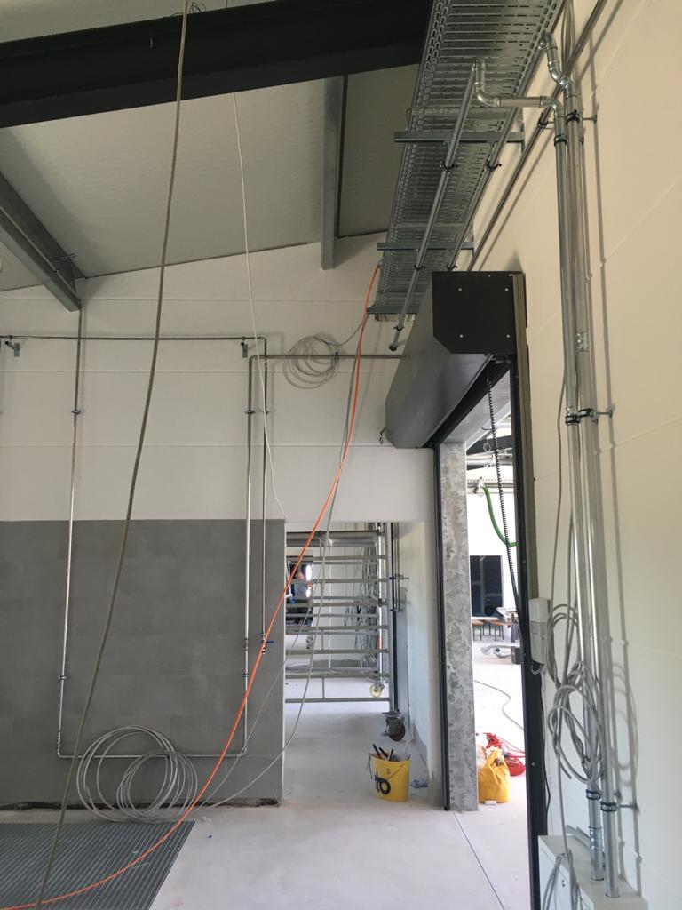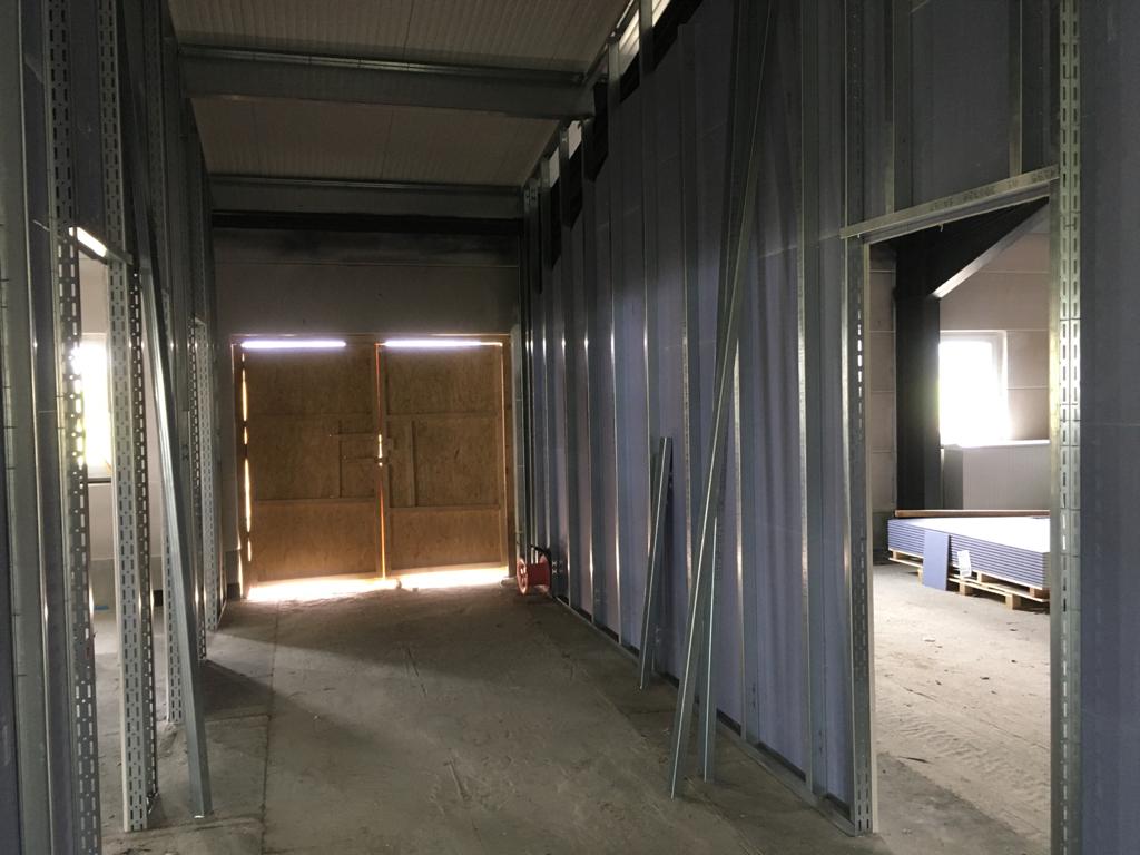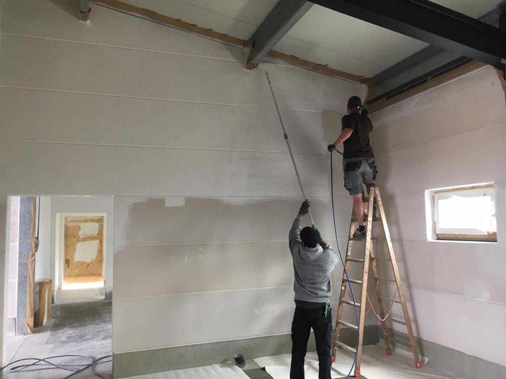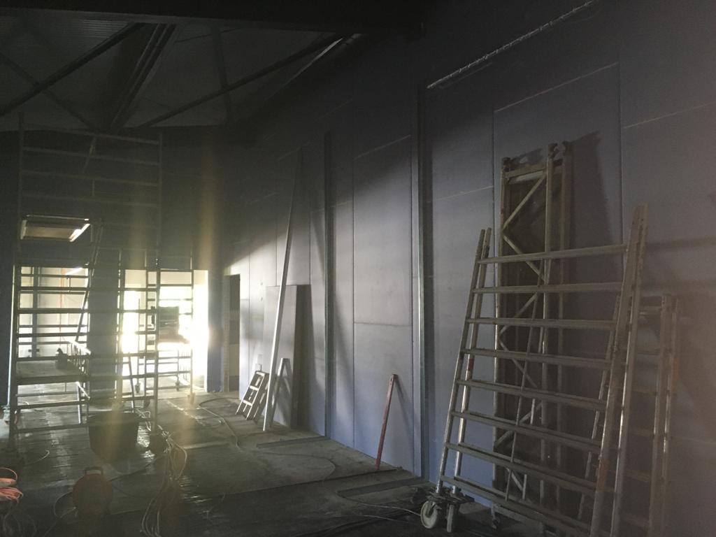 Das sieht doch gut aus! Die fertig gestrichene Fahrzeughalle erstrahlt in vollem Glanz, der Aufbau aller Anlagen kann nun beginnen. Außerdem wurden die Verteilerkästen für die Fußbodenheizung im Gebäude gesetzt. Trockenbau, Wasser, Elektrik und Sanitär wachsen stetig, der Innenausbau geht zügig voran.