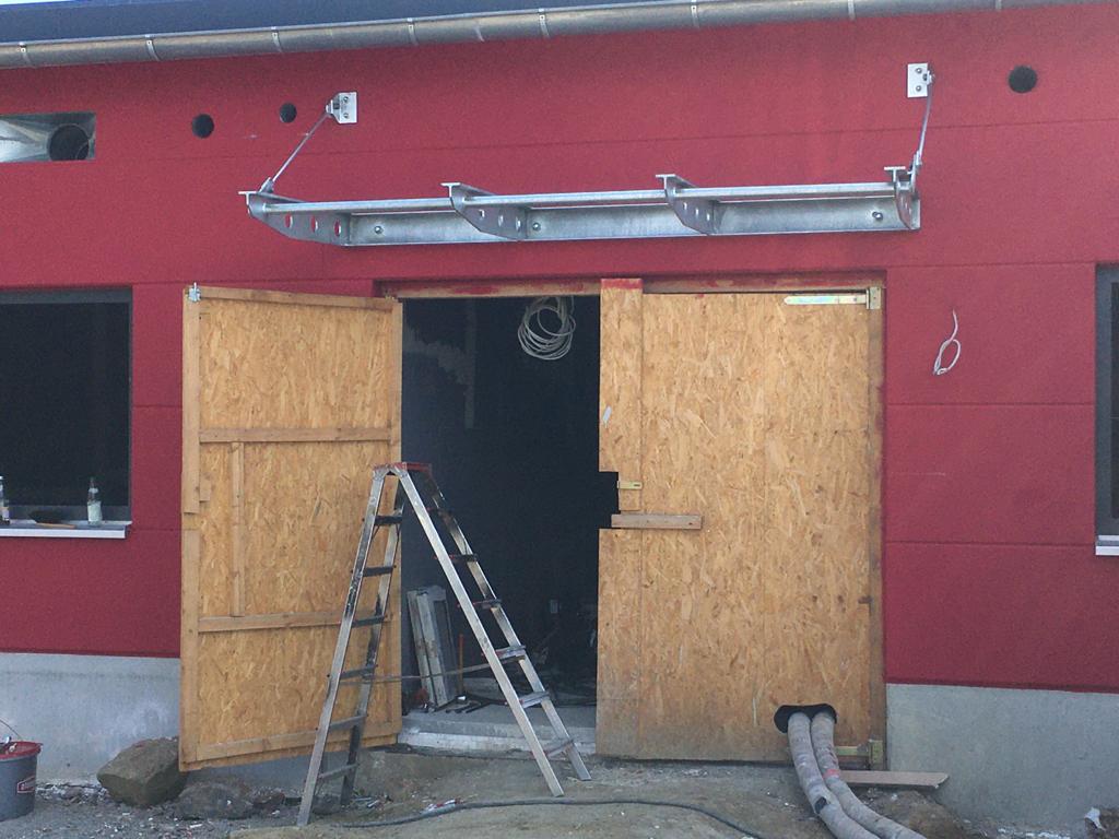 Endlich erscheint das Gebäude im richtigen Gewand! Die Fassade wurde gestrichen, sodass es nun auch als Feuerwehrhaus erkennbar ist. Danach wurde gleich das Vordach über dem Eingangsbereich montiert, auch das beleuchtete Schild mit unserem Namen haben einige unserer Kameraden in Eigenleistung installiert.