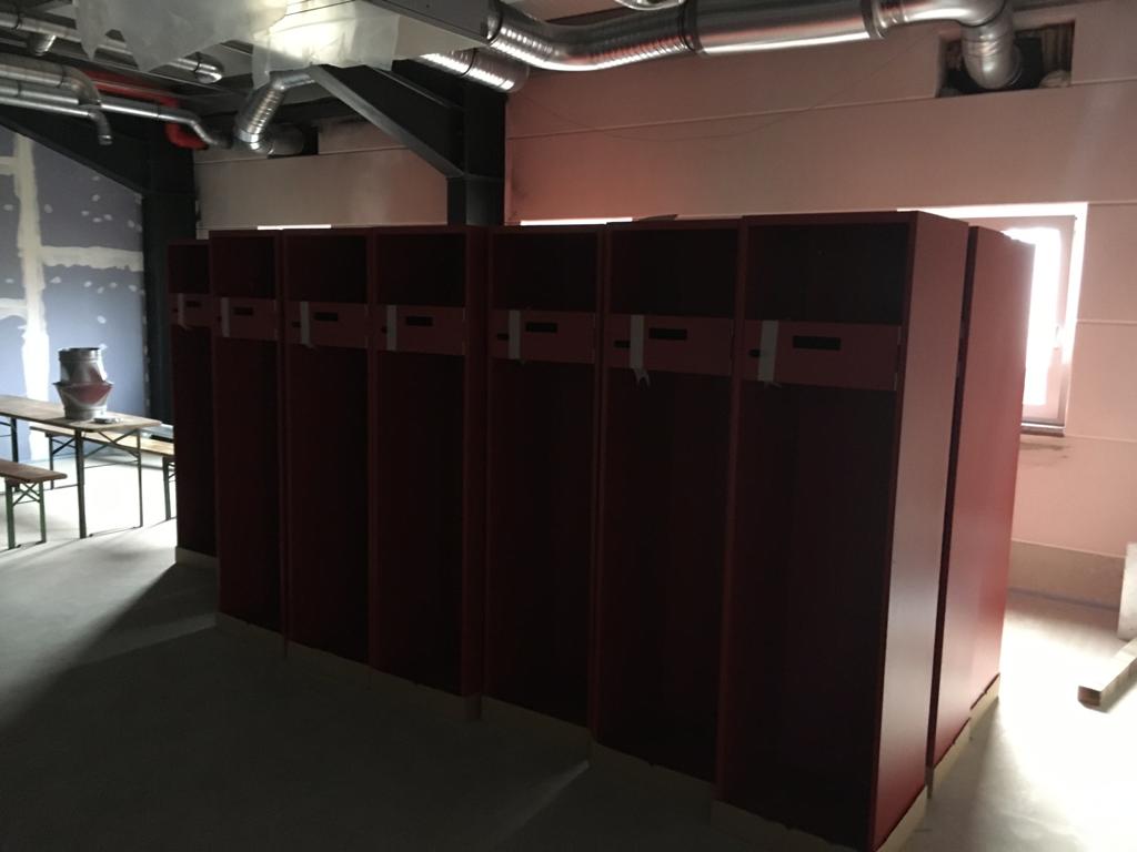 Die ersten Einrichtungsgegenstände kommen! Da das Gebäude von Außen schon ziemlich weit ist, ist es innen noch ziemlich leer. Das ändert sich ab dieser Woche, da die ersten "Möbel" geliefert wurden: Unsere Spinde für Damen- und Herrenumkleide sind da.