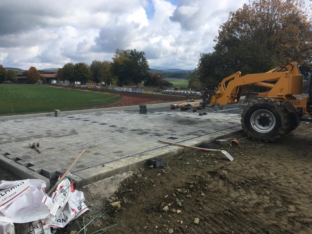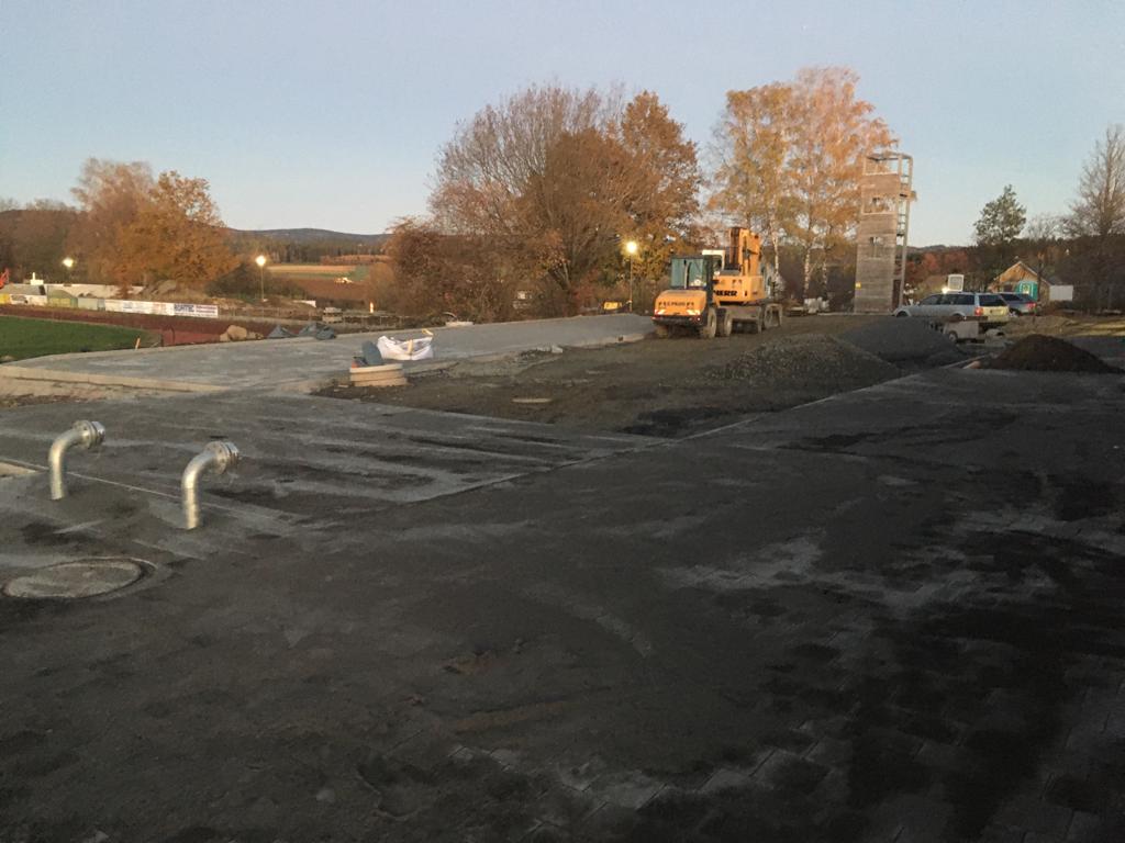 Die ersten Parkplätze entstehen! Weiter gehen die Arbeiten an den Außenanlagen, mit der erste Reihe an Parkplätzen wurde in dieser Woche begonnen. Die weiteren Parkmöglichkeiten entstehen dann entlang des Sozialtraktes, am oberen Ende des Platzes werden auch Stellplätze für Fahrräder errichtet.