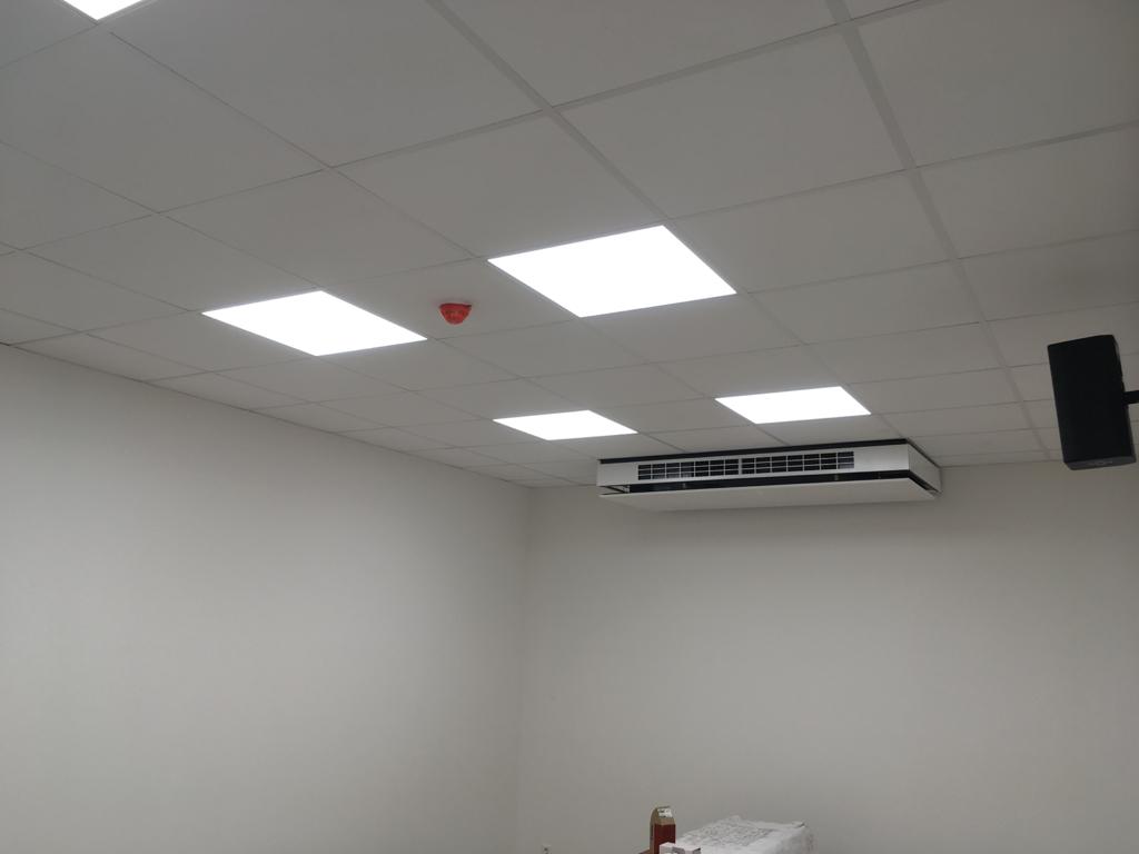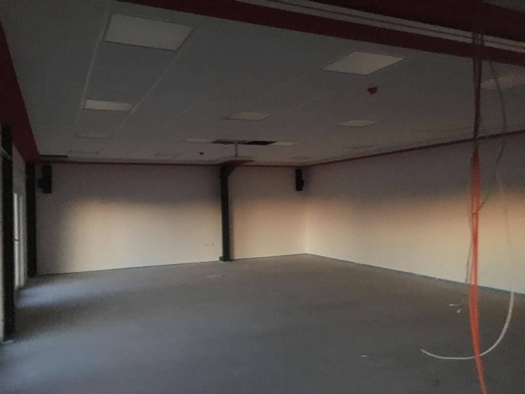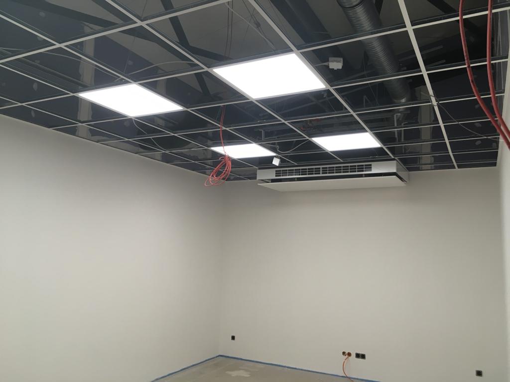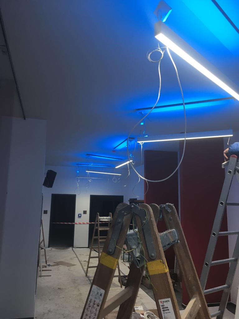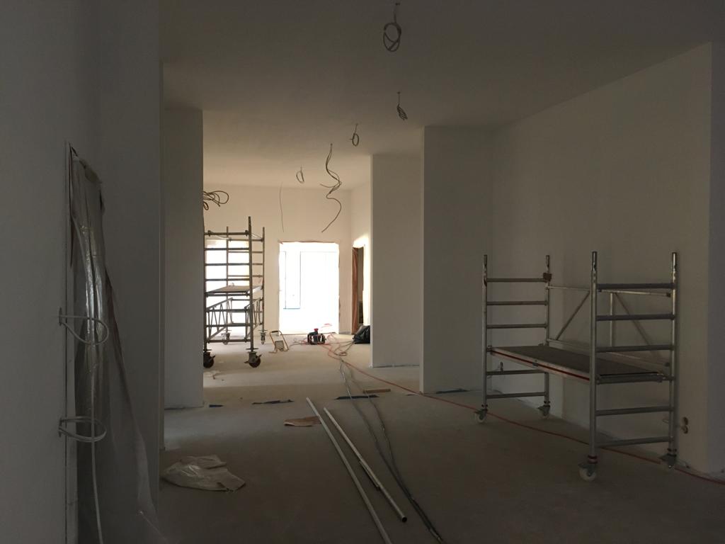 Licht an! Da die Deckenkonstruktion im Gebäude bereits fertig ist, konnten diese Woche die Lampen installiert werden. Außerdem wurde weiter fleißig gestrichen. Auf dem Vorplatz ging es auch voran, die Pflasterarbeiten für die Parkplätze sind in vollem Gang.
