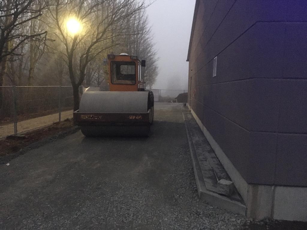 Boden innen, Boden außen! Aktuell wird in den Räumen im Sozialtrakt der Linoleum-Fußboden durch die Fa. Fröhler verlegt. Im Außenbereich bereitet die Fa. Braun derzeit alles für's Asphaltieren vor, damit kann dann in den nächsten Tagen auch begonnen werden. Außerdem wurde diese Woche die Beleuchtung im Flur durch die Fa. Hösele installiert.